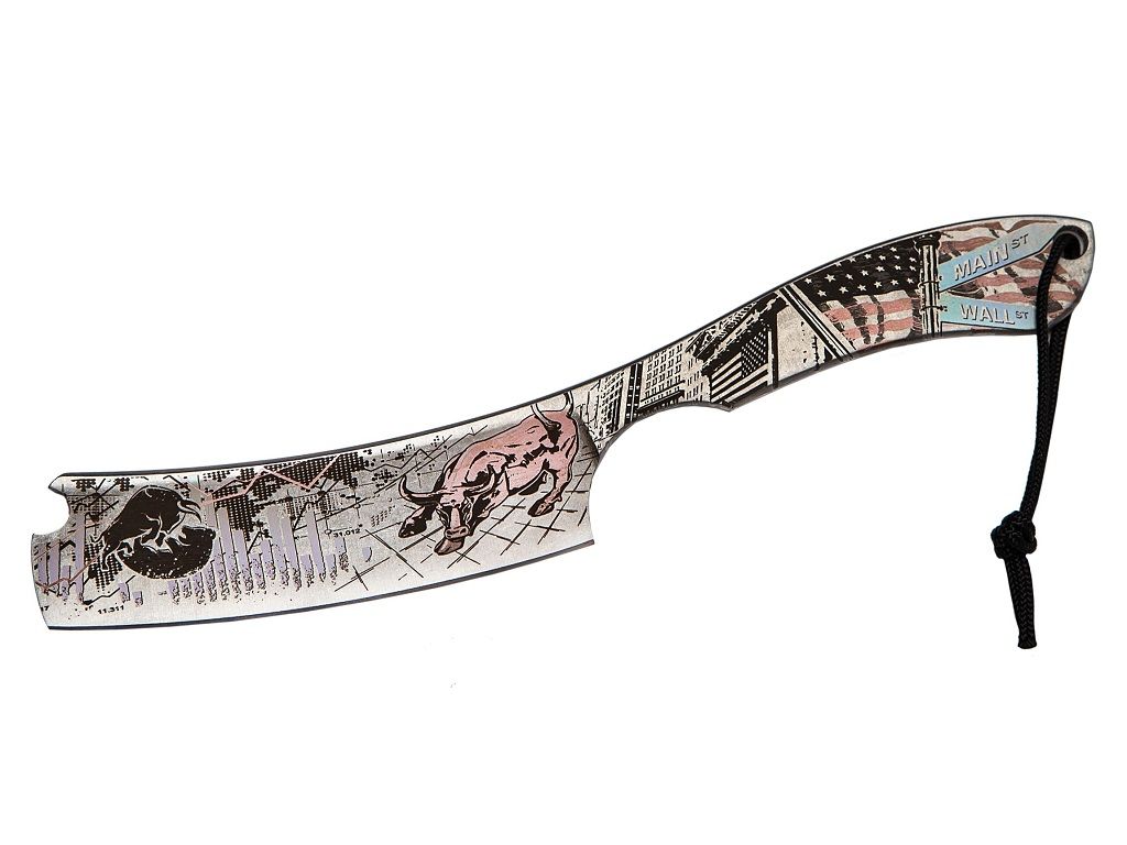 Конструктивно бритва Wall Street является цельнометаллическим ножом без накладок на рукояти. С обоих сторон клинок и рукоять украшены цветной гравировкой с символами деловой Америки. Все углы зашлифованы с большим радиусом, бритву удобно держать в руке, рукоять не врезается в ладонь. Имеется темлячное отверстие, с небольшим темлячком бритву удобнее извлекать из чехла.